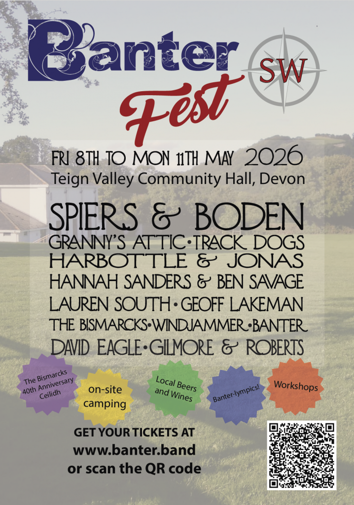 They released two critically acclaimed albums “Upstream” in 1999, and “Joanna” in 2005 with support from the English Folk Dance and Song Society (EFDSS) which remain quintessential references on top quality English traditional dance music. They took a pause on public performance together in the early 2000s to fulfil family commitments and pursue other projects but reformed briefly for what were going to be a couple of one off gigs in 2023, including a headline ceilidh at Sidmouth Folk Week. Now celebrating their 40th anniversary in 2026 , we are delighted to have The Bismarcks playing for you at BanterFest SouthWest.