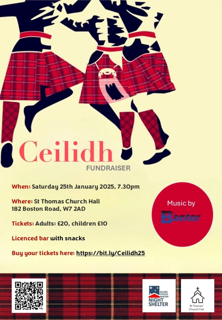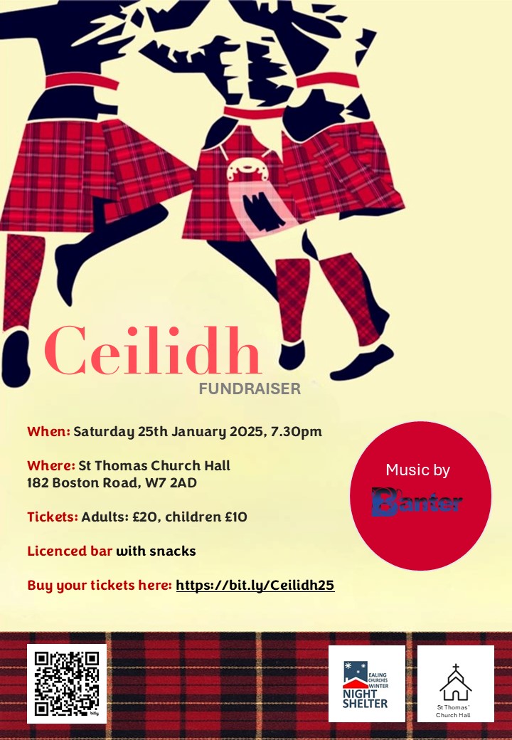 A chance to celebrate Burns Night and have a great night dancing. A fundraiser for Ealing Churches Winter Night Shelter and for St Thomas’ Church Hall Renovation Fund. Tickets available via this link or use the QR code on the poster.
